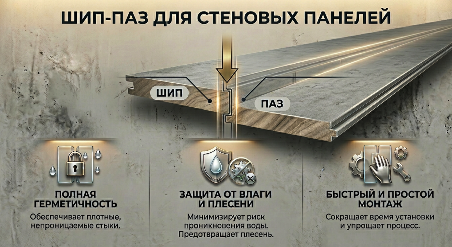 Особое внимание заслуживает супер замок, который не проводит воду. Благодаря этой инновационной системе соединения панели становятся полностью герметичными и надежно защищают стены от влаги, конденсата и прямого попадания воды. Это делает их оптимальным решением для влажных зон, таких как ванные и кухни, где обычные материалы быстро теряют вид. Панели монтируются на клей, что значительно упрощает и ускоряет процесс установки без использования сложных конструкций и специального инструмента.